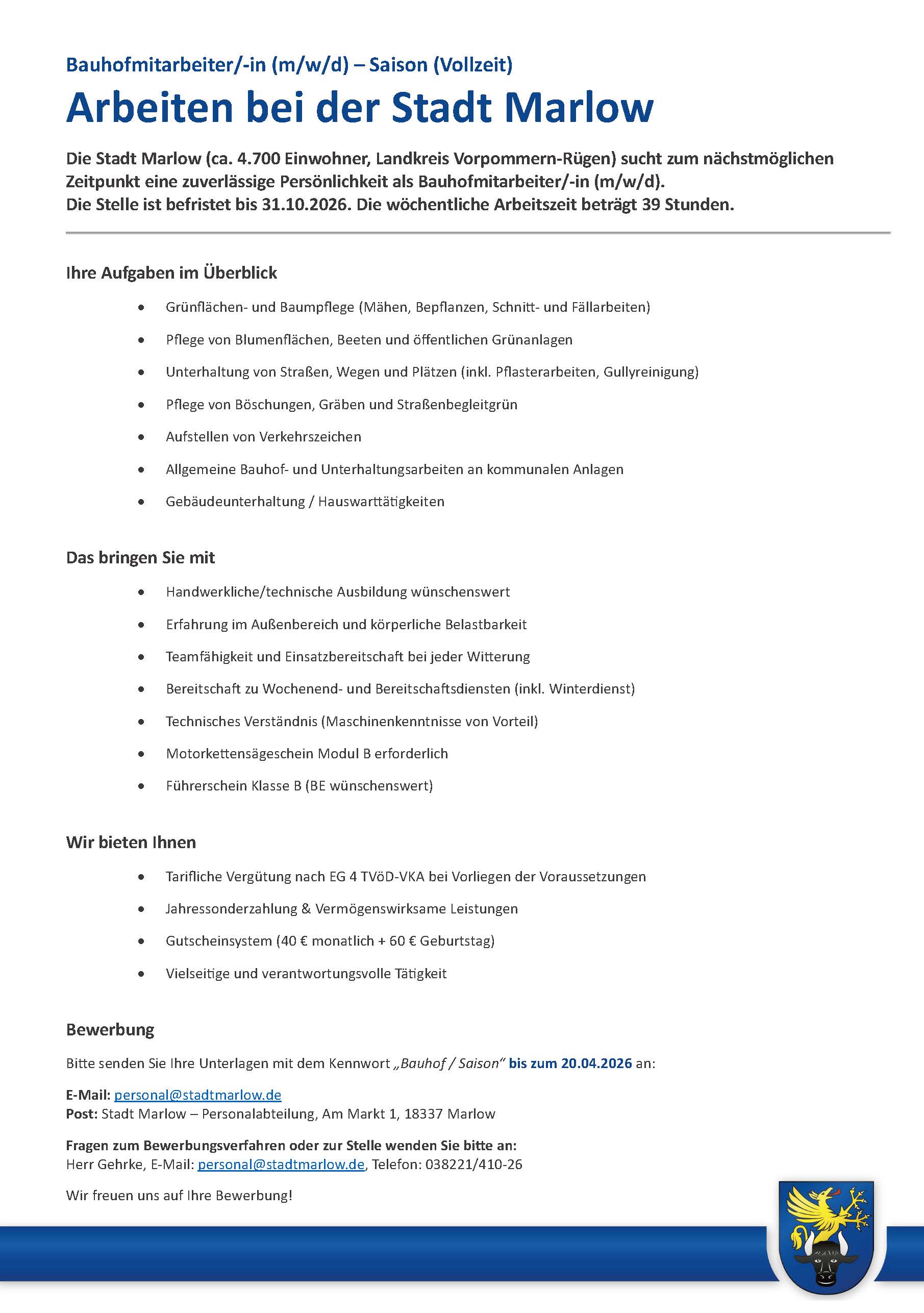| Bauhofmitarbeiter/-in (m/w/d) – Saison in Vollzeit (39 Std./Woche) | |